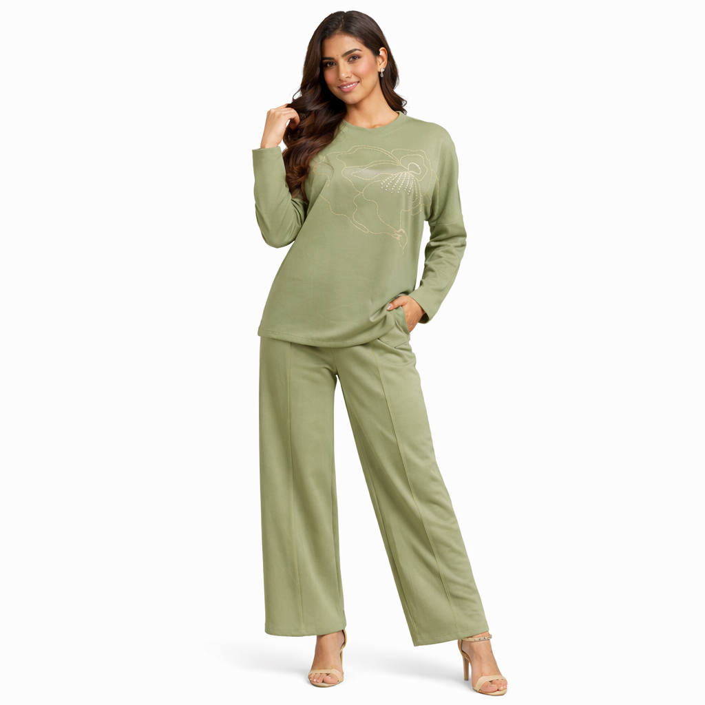 Upgrade your everyday style with this elegant olive green western co-ord set for women from The Glow Grace. Designed for modern women who love comfort with fashion, this outfit features a soft full-sleeve top with a subtle floral print and relaxed wide-leg pants. The premium fabric feels smooth on the skin, making it perfect for daily wear, casual outings, travel, or relaxed evenings. Pair it with heels or flats to create a classy western look that never goes out of trend.