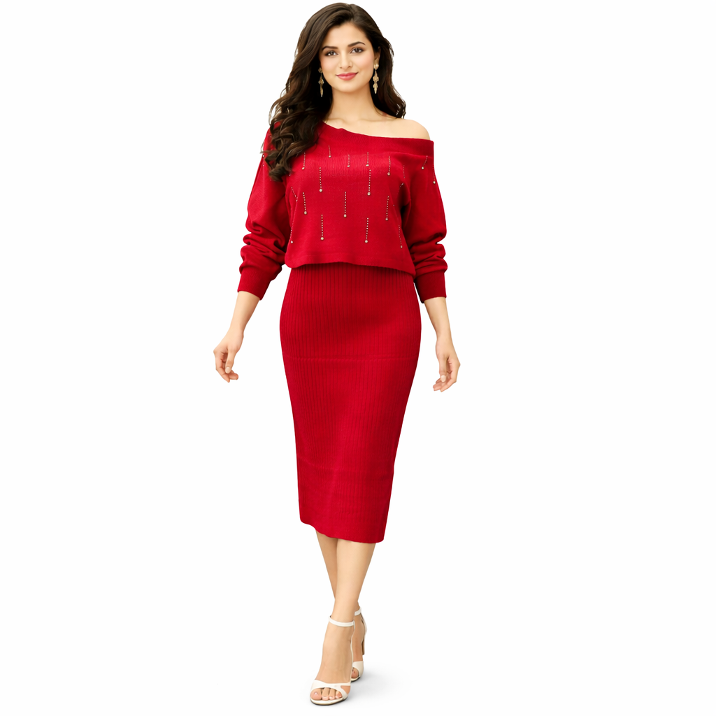 Turn heads with this elegant red western dress from THEGLOWGRACE. Designed with a stylish off-shoulder knit top featuring subtle bead detailing and paired with a sleek ribbed midi skirt, this outfit offers a perfect blend of modern glamour and comfort. The flattering fit enhances your silhouette, making it an ideal choice for parties, evening outings, and special occasions.