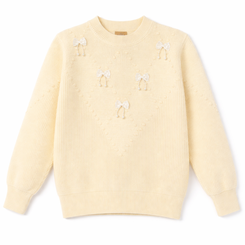 Ye women two-tone knit sweater ek elegant aur trendy western winter dress hai jo modern fashion ko soft feminine detailing ke saath combine karta hai. Is sweater ka light yellow done-colour look subtle aur premium appearance deta hai, jo online product images me bhi kaafi attractive dikhta hai. Front side par lage bow aur pearl embellishments is sweater ko classy aur unique banate hain. Soft knit fabric comfortable feel deta hai aur winter season ke liye ideal warmth provide karta hai. Casual outings, college, office ya daily wear ke liye ye stylish western sweater jeans, trousers aur skirts ke saath perfectly match hota hai.