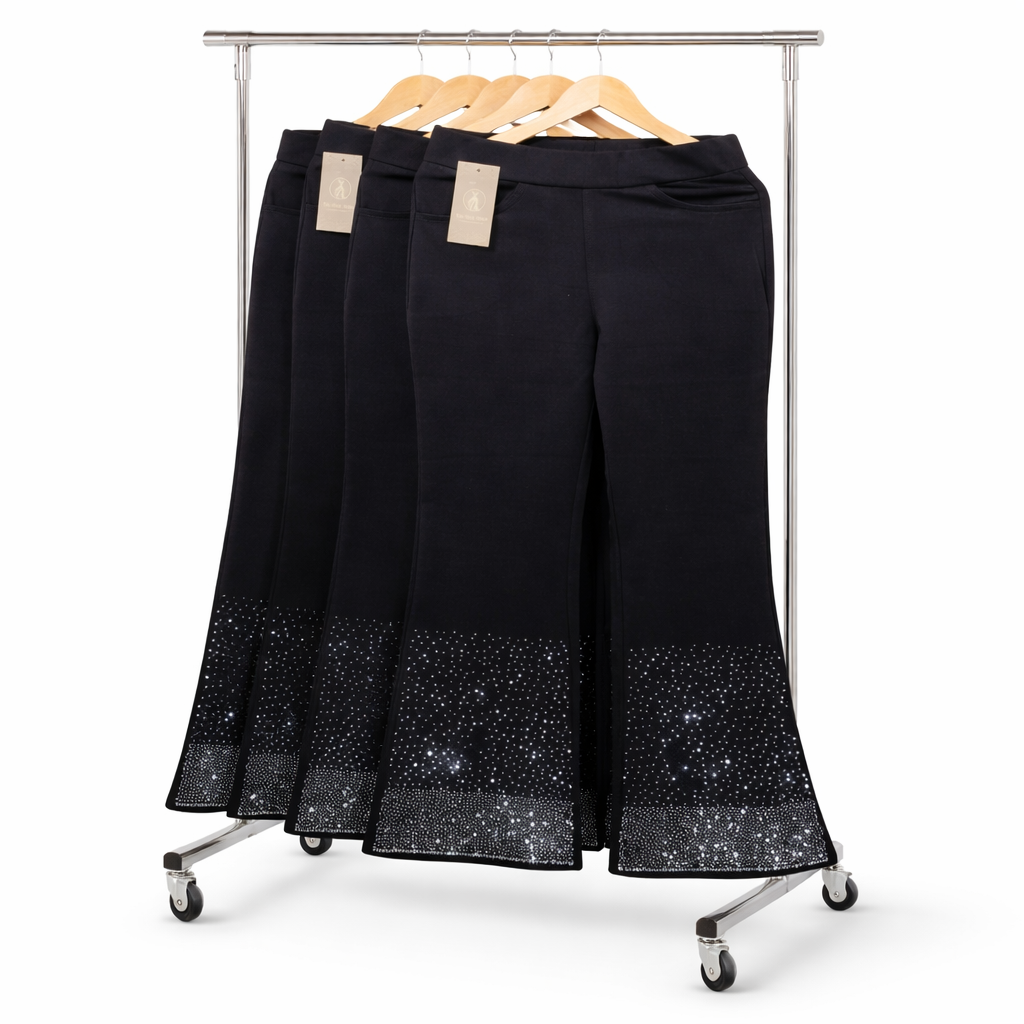 Upgrade your western wardrobe with these elegant black flared palazzo pants, designed to deliver both comfort and style. Made from premium stretchable fabric, these pants feature a high-waist fit that flatters your body shape while offering all-day ease. The subtle shimmer and stone detailing at the hem add a classy and modern touch, making them perfect for casual outings, parties, office wear, or festive styling. Easy to pair with tops, shirts, or kurtis, these versatile palazzo pants are a must-have for every fashion-forward woman.