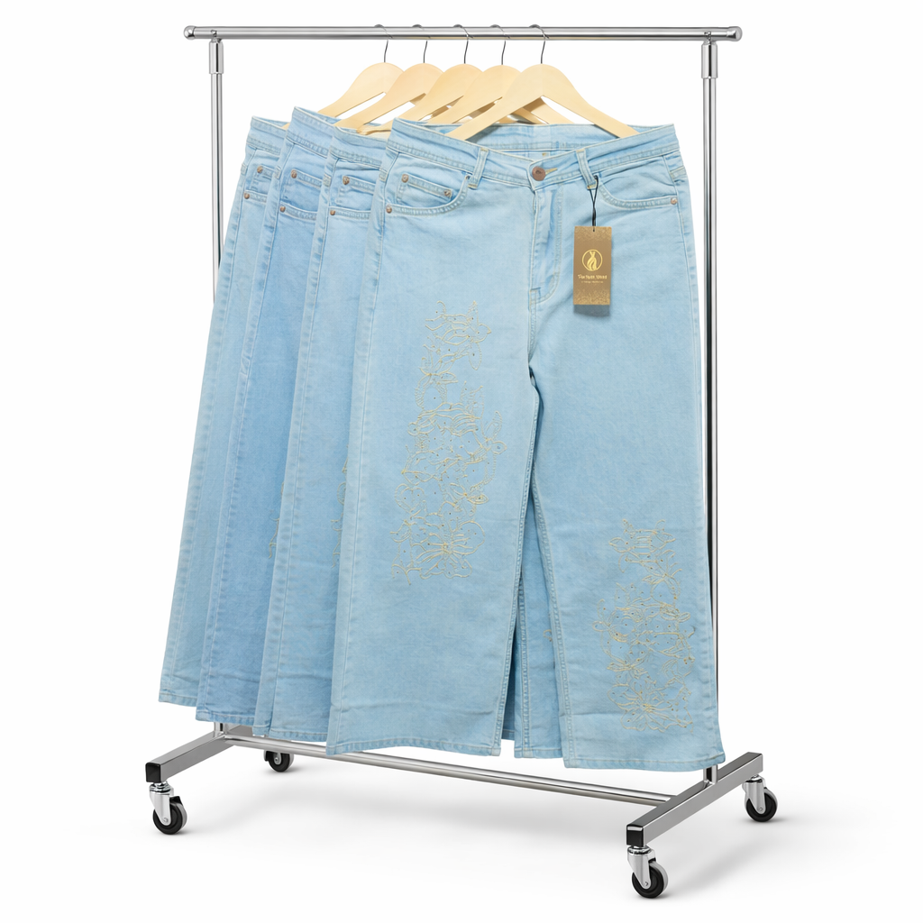 Refresh your western wardrobe with these light blue floral embroidered denim jeans, designed for modern women who love style with comfort. Made from premium-quality denim fabric, these jeans feature elegant embroidery that adds a classy and trendy look. Perfect for casual outings, college wear, and party styling, this design ensures a flattering fit and all-day comfort.