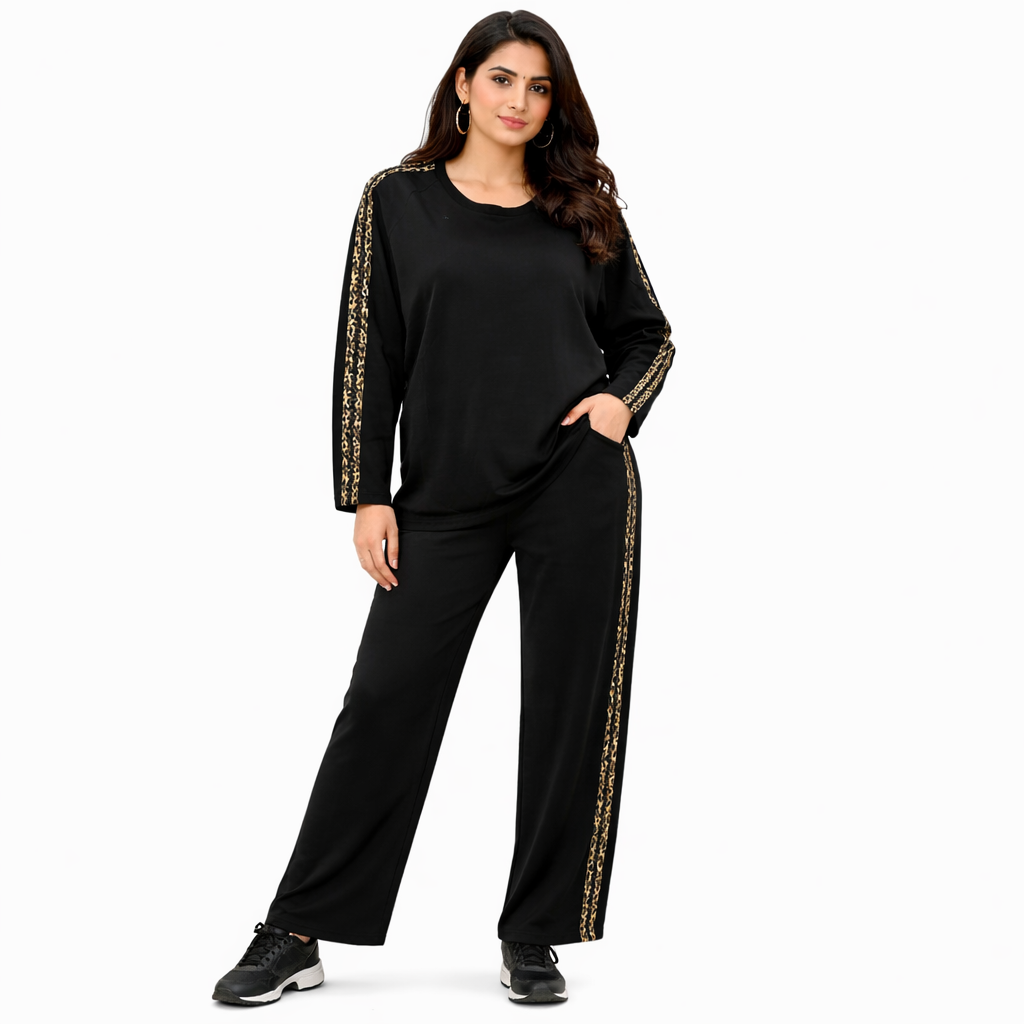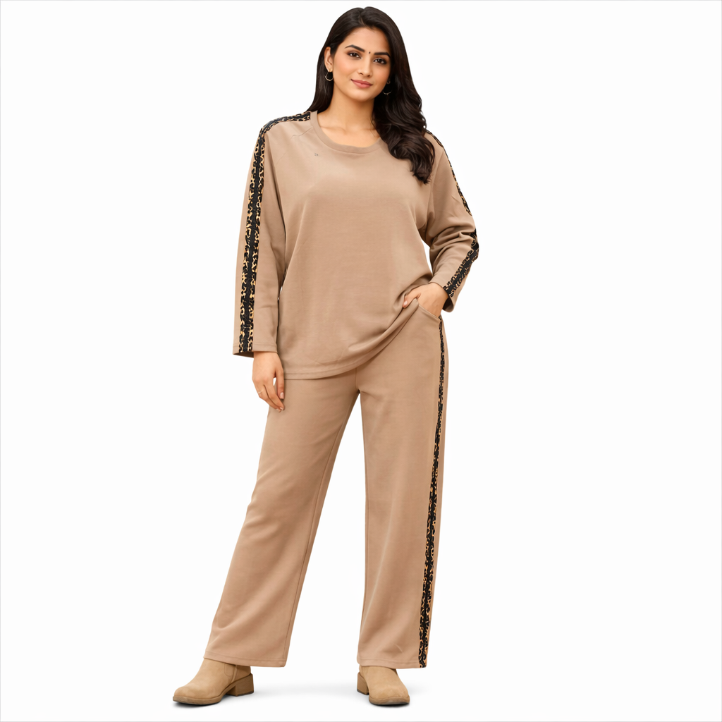 Elevate your everyday fashion with this stylish women’s western co-ord set, designed for comfort and modern appeal. This outfit includes a solid long-sleeve top paired with matching straight-fit pants, highlighted by trendy side print detailing that adds a premium look. Crafted from soft, breathable fabric, this western dress is perfect for casual outings, travel, daily wear, and relaxed office looks. Available in two classic colours – Black and Beige, this co-ord set offers effortless styling and all-day comfort for confident women.